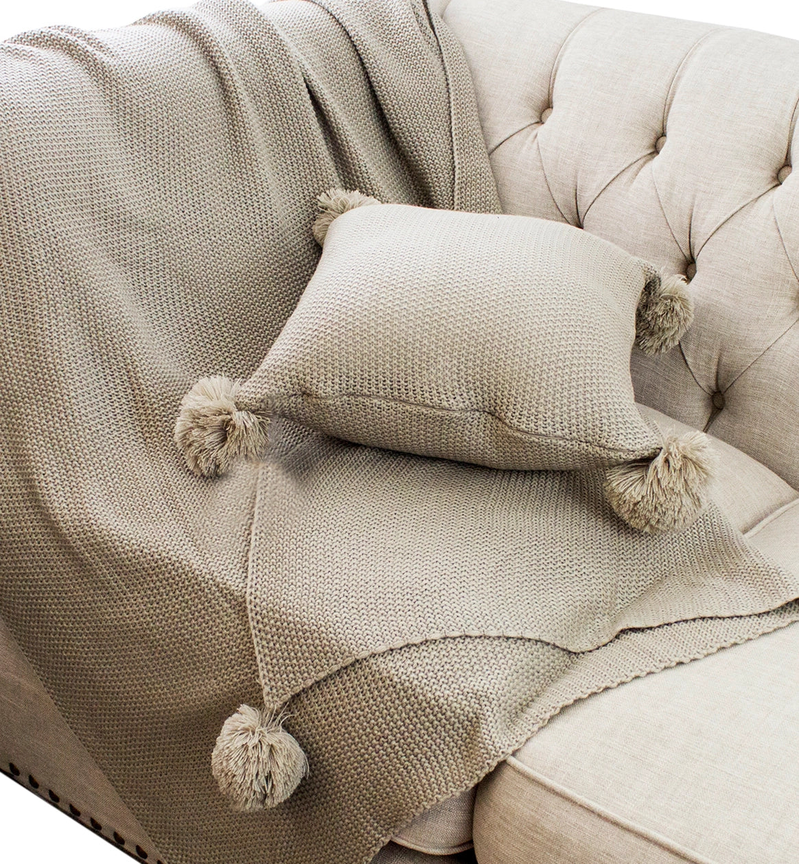 Khaki Chunky Knit Pom Pom Throw Pillow Cover