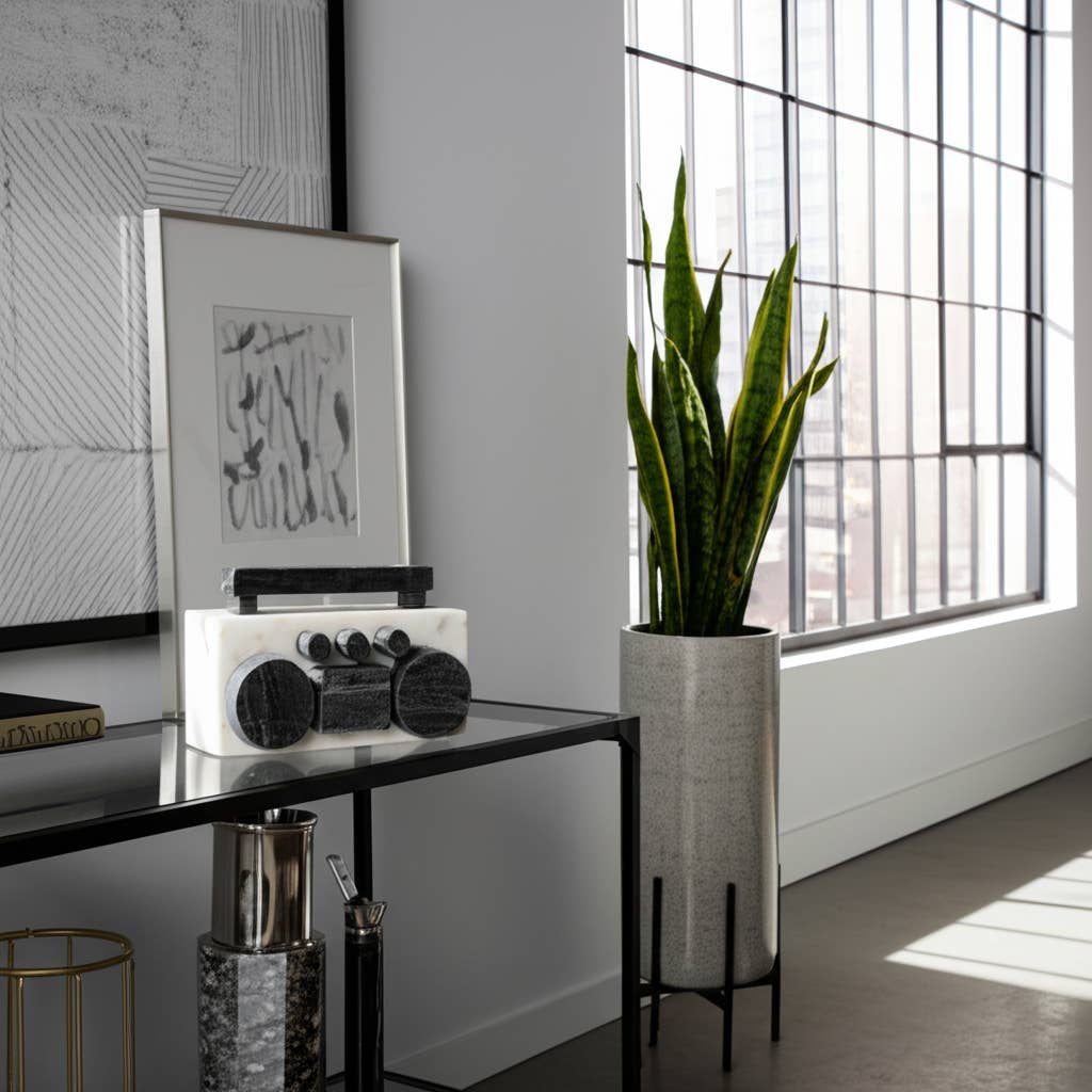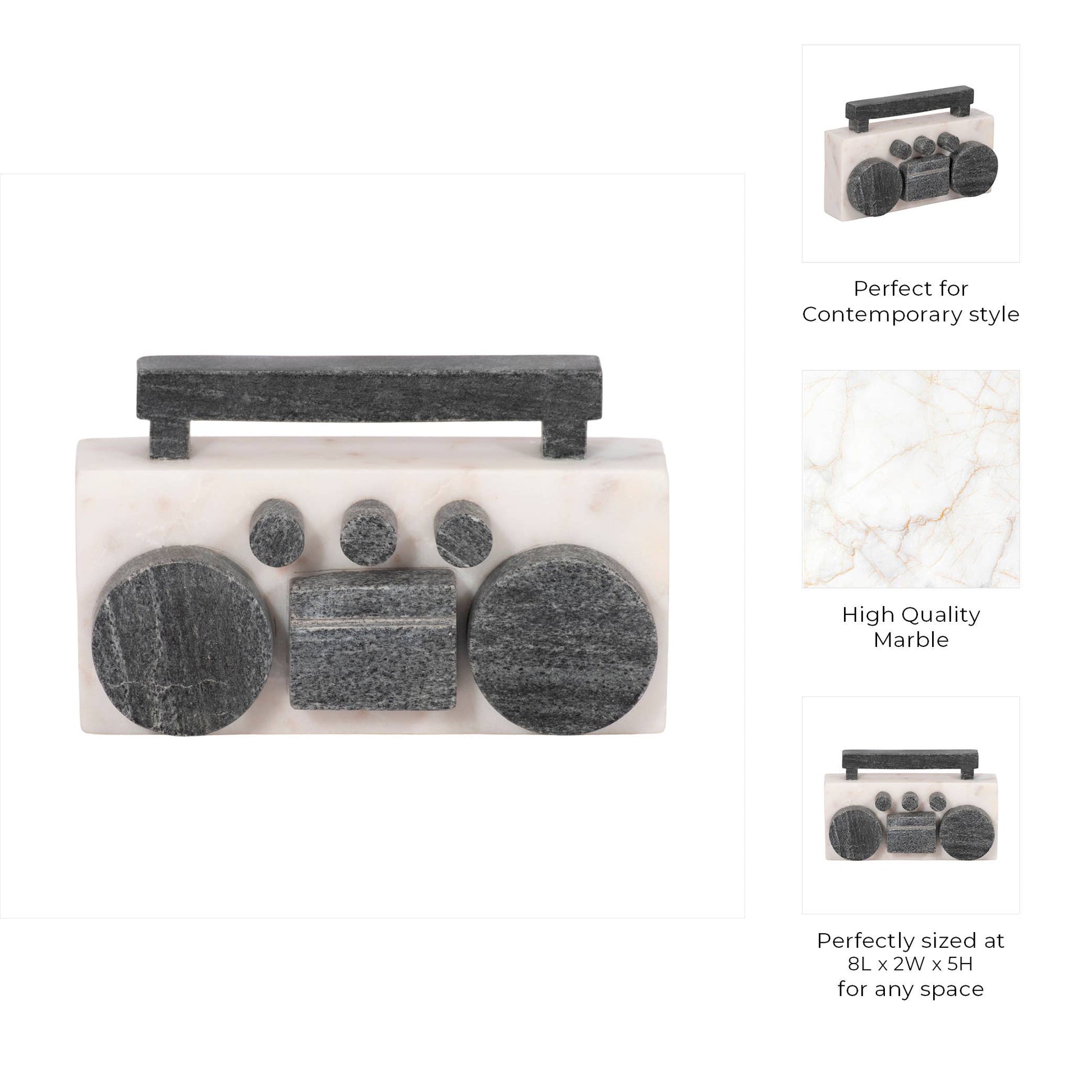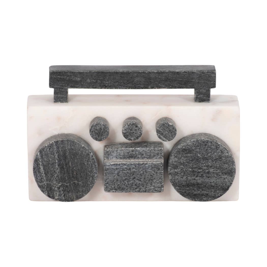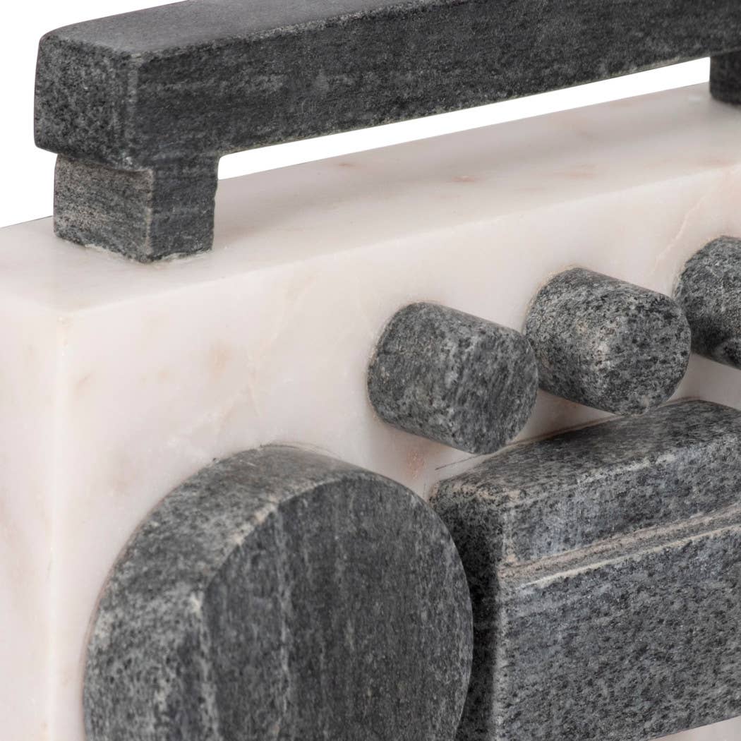 Crafted from smooth white and black marble, this sculptural boombox blends retro nostalgia with modern elegance. Every piece is unique thanks to the natural stone texture.